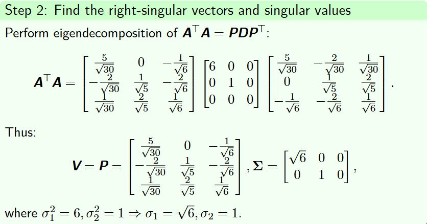 对ATA进行相似对角化,得到的 P就是奇异值分解中的V, 对D删掉只有零的行,将特征值降序排列求根号得到∑ 。